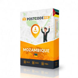 Šiame produkte yra visas pašto kodų/miestų sąrašas Mozambike. Faile yra 0 pašto kodai, 137 miestai visoje šalyje.Failo pavyzdį rasite paspaudę čia