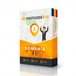 Šis produktas yra atsisiunčiamas failas. Faile yra visų šios šalies pašto kodų, miestų ir gatvių sąrašas.Atsisiunčiamame faile yra 24 392 pašto kodai, 24 559 miestai ir 42 795 gatvės Rumunijoje, kurias galima atsisiųsti „Excel“, CSV arba SQL formatu.Failo pavyzdį rasite paspaudę čia